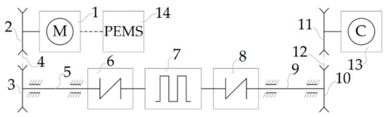 The view of the test station: 1—test engine, 2—active pulley , 3—passive pulley , 4—pulley (ratio 1:1), 5 and 9—intermediate shaft, 6 and 8—clutch with a susceptible insert, 7—torque measuring shift with speed measurement, 10—active pulley , 11—flywheel , 12—link transmission (ratio 5:1), 13—wood chipper, 14—portable emissions measurement system (PEMS). In the system the relationship is maintained.