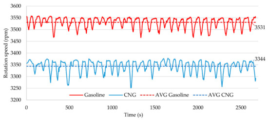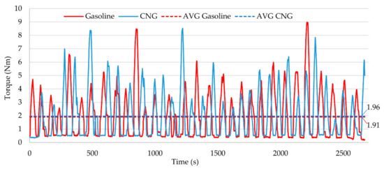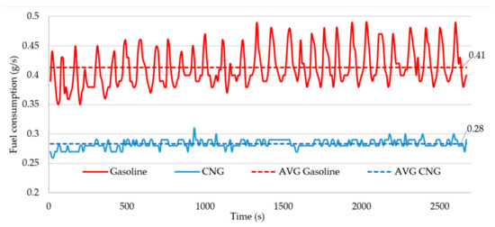 Another effect of using CNG installations is a 32% reduction in fuel consumption (Figure 14). Such an effect is also noticeable by other scientists [72]. It is also often associated with the loss of power and torque characteristics (Figure 2), and dynamics of the examined drive unit [86,87]. In the analysed design, the authors observed a reduction of maximum power by 23% and torque by 15%. At the same time, these changes did not affect the shredding process and did not change the characteristics of the machine in the area of works and tests (the load due to the strength of the cutting mechanism was 20% lower than that allowed by the manufacturer, who expressed it in the diameter of the branches to be shredded and their hardness—hardwood species [61] to 100 mm in diameter). The reduction of fuel consumption after the use of CNG, and at the same time the reduction of power and torque of the engine, is related to the reduction of the volumetric efficiency of the CNG-fuelled engine, due to the greater share of air during CNG combustion (AFR CNG 17.2: 1, AFR gasoline 14.7:1). The lower fuel consumption expressed in g/s is reliable, but it is difficult to interpret the cost of machine use. Firstly, gasoline is sold in EUR/L (0.99 EUR/L in Poland on 11 November 2020 [88]), while CNG in EUR/m3 (0.71 EUR/m3 in Poland 11 November 2020 [89]). The authors made the necessary calculations to facilitate the interpretation of the machine operating costs resulting from fuel consumption and determined the hourly cost of machine operation for the system powered by gasoline at about 2.02 EUR/h, while during operation with CNG at 0.95 EUR/h. The operating cost of the wood chipper under test, resulting from fuel consumption, is 53% when running on CNG compared to using gasoline.