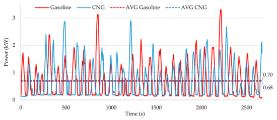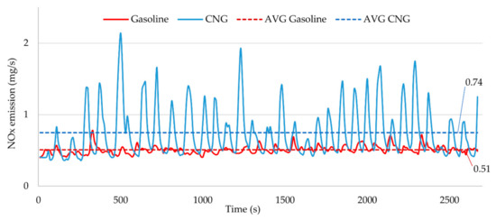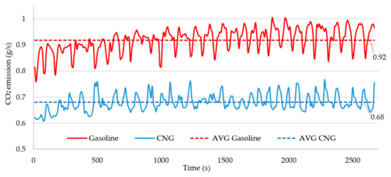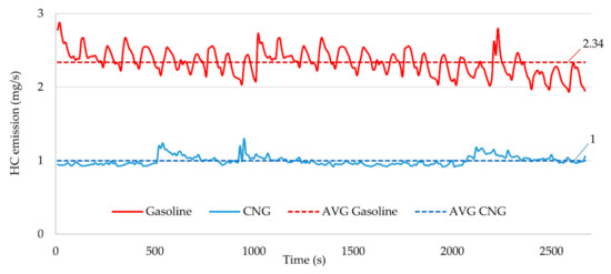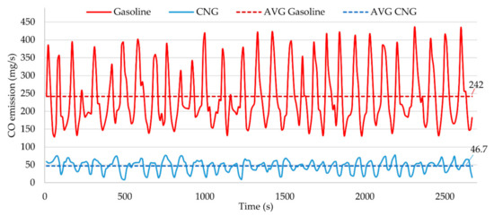 In order to control efficiently the drive unit and to evaluate the reaction of the tested design to changes in the operating conditions, the emission of the generated exhaust gas compounds as a time function should be measured. The results may show areas that need improvements in the design. The results of exhaust emission tests over a specified period of time should also be considered important. These characteristics are presented in Figure 14 along with the average values. They provide information on the influence of selected machines on global or local exhaust emissions, thus allowing their comparison. Such a comparison (for gasoline and CNG) is presented in Figure 14 and Figure 15 on a percentage scale calculated according to Equation (7):