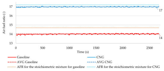 Air-fuel ratio (AFR) characteristics for the engine powered by gasoline and CNG.