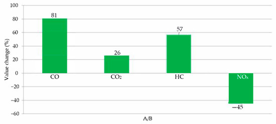 Influence of the fuel supply system on selected values of exhaust emissions, where: A—gasoline fuel supply system, B—CNG fuel supply system.