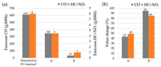 Comparison of exhaust emissions of the designs tested with the exhaust emission limits in the European Union; (a) the emission limit value and the emissions during shredding processes; (b) the value of the difference between the emission limit value in the EU and that produced during shredding expressed as a percentage, where: A—gasoline fuel supply system, B—CNG fuel supply system.