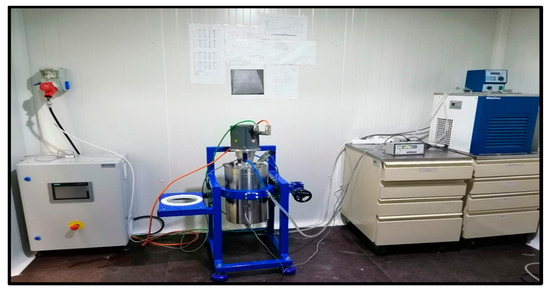 A novel apparatus of internal volume of 5.7 L has been designed and built to carry out studies on the scale up of gas hydrate formation. A schematic diagram of it is shown in Figure 1. The reactor has been designed to maximize interfacial area between reactants, thus minimizing mass transfer barriers and thermal effects that negatively affect conversion of reactants into hydrate. Gas is supplied by gas bottles through a pressure-reducing valve that provides adjustment of the pressure to the gas injection line. Mixing is supplied by a servomotor type of High Inertia (permanent-magnet synchronous motor Siemens model SIMOTICS S-1FL6). The high-pressure cylindrical AISI 316L stainless steel vessel has an internal diameter of 150 mm and an internal length of 312 mm. It has been designed for pressure values up to 150 bars and provided with a safety valve. In order to avoid friction heat due to rotational speed of impellers, cooling water is circulated around the shaft of the motor. The flow rate of refrigerated cooling bath (WCL-P12) is 12 L/min. The cooling medium is distillated water. Figure 1 shows the methane–propane hydrate formation reactor with the control unit and cooling bath.