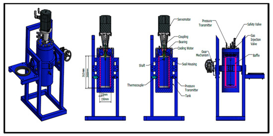 The temperature of the refrigerated cooling bath was measured by a thermocouple inside of the bath. Two AISI 316 L stainless steel flanges are used to seal the reactor. One flange has appropriate ports for access to the interior. The five ports (3 on flange and 2 on the body of the reactor) are used for supplying gas and measuring temperature and pressure. The temperature sensors are mineral insulated type TW/T (Threaded Type Thermowells) with accuracy (±0.2 %) and measure the temperature inside in the middle part of the vessel. The Piezoresistive pressure sensors (Keller Series 21 Y) gives digital output with accuracy ±0.25 FS%. The gas inlet line is equipped with a gas pressure regulator with accuracy 0.6. Gas is supplied by gas bottles through a pressure-reducing valve that provides adjustment of the pressure to the gas injection line. Voltage signals from pressure transducers and temperature sensors collected by a PLC unit (software) for data acquisition on a personal computer. Torque measurements are also taken by PLC unit. The shaft and baffle are made by steel AISI 316L and AISI 304 equivalently, while the impellers are made by acrylonitrile butadiene styrene (ABS) plastic. Figure 2 shows the cross-sectional design of our reactor.