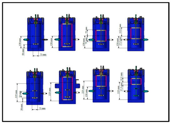 Figure 3 shows analytically the dimensions of reactor, impeller and baffles and the different designs (different baffles) of reactor with single and dual Rushton turbine (RT) impellers. First up-row from left to right: single impeller with no baffle, single impeller with full baffle (15 cm submerge in the water), single impeller with half baffle (7.5 cm submerge in the water) and single impeller with surface baffle (3.75 cm submerge in the water). The distance between the two impellers in the dual ones are 7.5 cm. The height of liquid is the same with the diameter of reactor, 15 cm in the single impeller and 22.5 cm in the dual impellers. The width of baffles is 1 cm while the internal diameter of reactor is 15 cm. The sparger has 1 cm height and is used for better gas–liquid contact for mass transfer and reaction. The bottom of clearance (distance between bottom of reactor and impeller) is 5 cm.