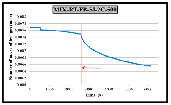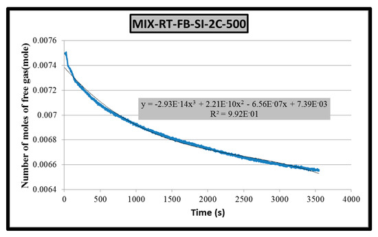 The main objective of this study was to investigate the effect of different impeller–baffle configurations on hydrate formation kinetics. Therefore, a tool must be devised to extract the kinetic data from raw experimental data. Application of real gas law (PV = znRT) for each data point with known pressure, temperature and free gas volume gives the change in number of moles of free gas with time together compressibility (z) factor by using Lee and Kesler’s (1975) fortran program (in this program you can calculate the number of moles and compressibility factor (z) for every component if you know pressure, temperature and volume) [28]. A sample plot of change in free gas number of moles is given in Figure 4 for CH4-C3H8-SI-RT-FB.