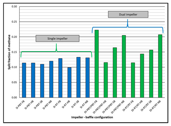 Split fraction of methane for single and dual impeller experiments (experimental temperature 2 °C).