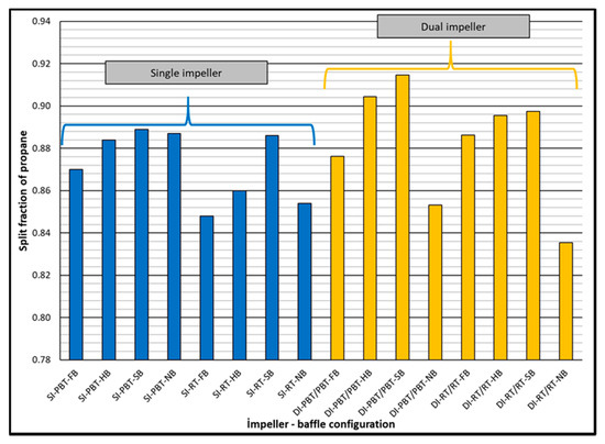 Split fraction of propane for single and dual impeller experiments (experimental temperature 2 °C).
