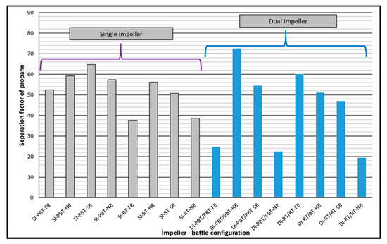 Separation factor of propane for single and dual impeller experiments (experimental temperature 2 °C).