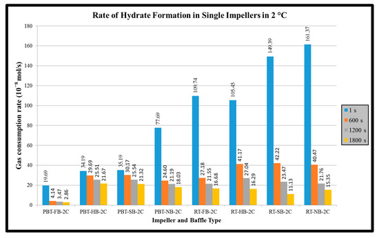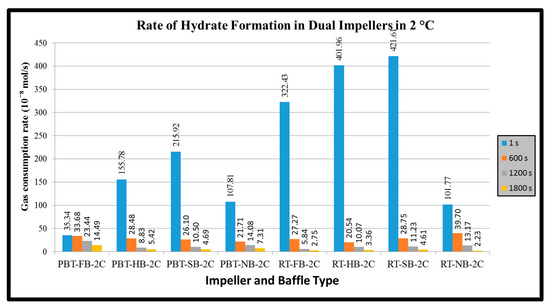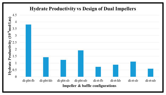 Another parameter that was calculated is hydrate productivity. In single experiments, the hydrate productivity results follow the opposite way of rate of hydrate formation. PBTU experiment has higher values compared to RT experiments. The highest value of hydrate productivity occurs in PBTU with full baffle experiment (10.78 × 10−8 × s−1 × L−1) while the lowest value of hydrate productivity takes place in RT with surface baffle experiment (4.2 × 10−8 × s−1 × L−1). The same behavior happens in dual experiments. The highest value of hydrate productivity occurs in PBTU/PBTU with full baffle experiment (3.81 × 10−8 × s−1 × L−1) while the lowest value of hydrate productivity takes place in RT/RT with no baffle experiment (0.58 × 10−8 × s−1 × L−1). It is obvious that in dual experiment or RT/RT with no baffle the hydrate formation occurs only for the first 30 min of the process. Figure 11 and Figure 12 present the hydrate productivity for single and dual impellers, respectively.