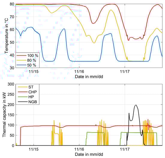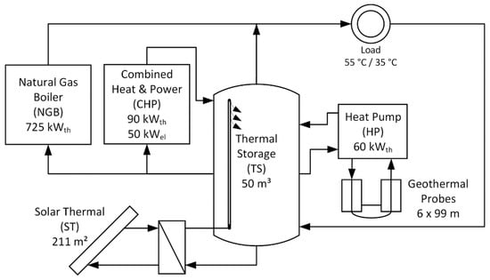 The classical control strategy of energy supply systems is based on a simple switch-on sequence of the heat generators. Thereby the units switch on in descending order of their efficiency (for further information see Section 5). Since primarily the weather conditions determine the heat output of the solar thermal system, it cannot be switched on arbitrarily. This results in the following switch-on sequence: solar thermal (ST), combined heat and power plant (CHP), heat pump (HP), natural gas boiler (NGB). The latter only feeds directly into the heating network and supplies the residual power to maintain the required network flow temperature. The remaining heat generators feed only into the heat storage, which means that their heat generation is decoupled from the heat demand of the network over time. The solar thermal system always supplies heat as soon as the irradiation is sufficient to reach the required target value. The CHP starts as soon as the center of the storage falls below a temperature limit. The heat pump switches in addition, if in the upper third of the storage a temperature limit value is fallen below. The boiler starts up when supply temperature is below a set point. This is illustrated in Figure 2.