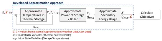 Thus, it can be summarized that the prediction of storage temperatures (see Equation (9)) and the resulting storage or boiler power (see Equation (5)) as well as secondary energy quantities (see Equation (4)) are necessary to determine the system response in terms of CO2 emissions and operating costs for the prediction horizon. The challenge is to form as accurate a prediction as possible with a low computational effort. In the following, the individual approximation models and their implementation in the simulation environment are explained.