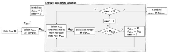 A disadvantage of Gaussian process regressions is the cubic increase in the computational effort of the training with the number of training data, as Liu at al. [] detail. For this reason, a selection algorithm based on differential entropy (see Ariel and Louzoun []) has been developed in this work to maximizes the mean information density in a specifically reduced training data set. In addition, a fixed number of recently accumulated data is added to the training data set to increase the actuality of the models. The following pseudocode summarizes the data selection Algorithm 1: