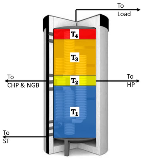 To improve the quality as well as the speed of the downstream approximation, not all possible storage layers are considered, but only four defined zones. This has the advantage that less approximation models must be created, the computational effort is reduced, and the gradients of the temperature changes are smoothed. Figure 5 shows the division of the heat storage tank into zones. The entire lower half of the storage tank was averaged to one zone (T1) since this zone is not directly relevant for the supply of the heating network and is mainly served by solar thermal energy. From the second zone (T2) the return flow for the CHP and boiler is taken. The temperature there is essential for the decision whether and how CHP and HP can be operated. The uppermost zone (T4) has the highest relevance for the supply of the heating network and is considered individually. The zone (T3) between T4 and T2 is required and used to calculate the storage temperatures above and below it (see Equation (9)). Due to the stratified charging system of the storage, which is not shown in Figure 5, the heat from the connected devices is fed into the respective zone with the lowest temperature difference.