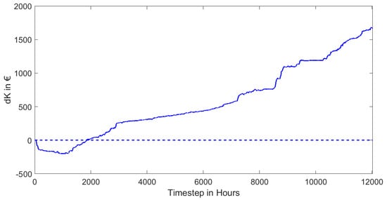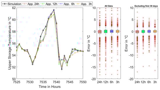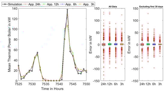 The distribution of the prediction errors is additionally shown for data that do not include the first 30 days, i.e., the learning phase of the optimizer. For the comparison, prediction horizons of 24, 12, 6 and 3 h were used. The differences to the results of the simulation described in Section 3 are shown as “errors”. Boxplots like the two right graphs in Figure 6 summarize statistical dispersion and location parameters in one plot. The median of the prediction error is marked as a horizontal line in the boxes, the range of values between the 25 and 75 percentile is marked as a box (=interquartile distance). The whiskers show the range of 1.5 times the interquartile distance. All values outside this distance are defined as outliers and are marked as red crosses.