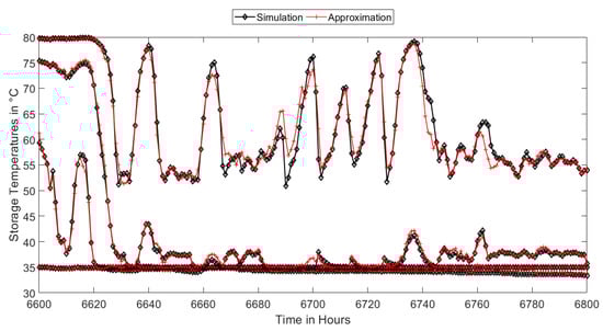 It becomes clear that the storage temperatures calculated for the end of a time interval are needed for the prediction in the following time step, so it is a recurrent approximation. According to Equation (9), there are dependencies between the individual storage temperatures, which requires the best possible predictions of these storage temperatures, especially for longer prediction horizons , to avoid excessive error propagation.