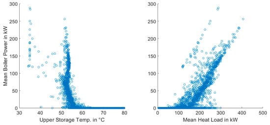 Figure 8 visualizes the boiler power over the average heat load as well as the uppermost storage temperature at the end of a time interval. The data are taken from a yearly simulation where random settings of the controllable variables were made.