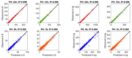 Like the boiler performance prediction, classical databased regression functions can be used for secondary energy predictions (gas consumption of CHP and boiler, electricity production of the CHP and electricity consumption of the WP, see Equation (4)). The resulting operating costs and CO2 emissions can be calculated using completely defined, functional relationships. Figure 10 shows the observed over the predicted sum of operating costs and CO2 emissions for different prediction horizons. The additionally given coefficient of determination R2 as a quantitative evaluation criterion shows the percentage of explained variance in the total variance.