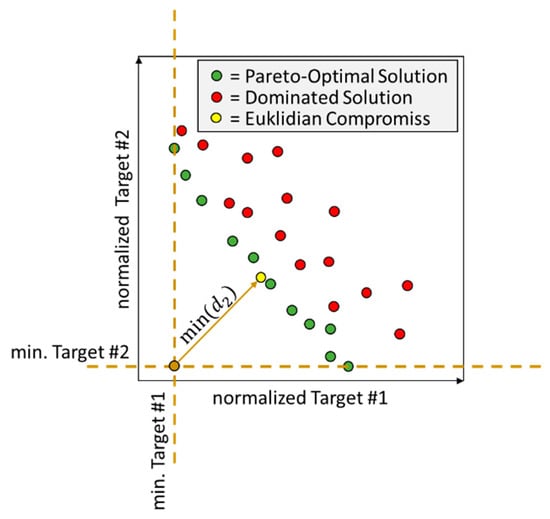 To use the approximations for an optimization, the data generation and multi-stage modeling (see Section 4.2 and Section 4.3) must be combined with an optimization algorithm. For the multi-objective optimization, here of operating costs and CO2 emissions, the use of a multi-swarm optimization (as developed by Coello Coello and Lechuga []) has proven to be performant. Several basic populations are moved through a search space by passing on the information of non-dominated individuals, whereby different approaches are used to reduce getting stuck in a local optimum. It is shown that especially by vectorizing the properties of the considered individuals or by parallelizing the evaluation of the functional relationships a solution can be found in a sufficiently fast time (here in less than 30 s).