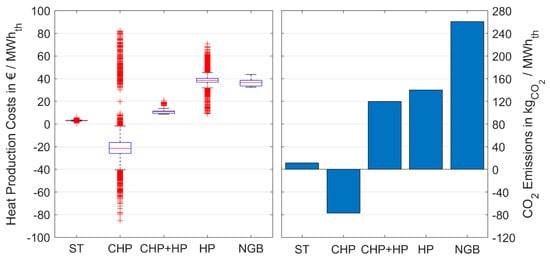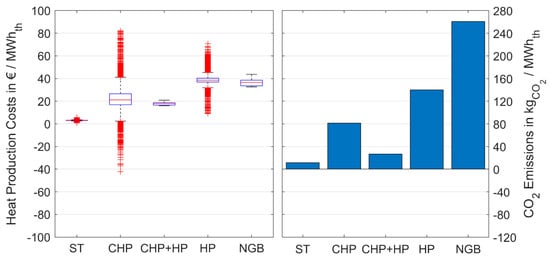 The German government-driven turnaround towards the increased use of renewable energy sources has far-reaching effects on the structure of the national energy supply []. In addition to effects on the electricity sector, this naturally also affects the heating market to achieve the energy policy objectives at the global, European and national level. To this end, it is necessary to further develop heat supply concepts and adapt them to the requirements of a holistic energy turnaround. Systems of the future, both centralized and decentralized, will be characterized by a high proportion of renewable energy with low primary energy use and low CO2 emissions, as well as a high degree of flexibility due to the fluctuation of renewable energies. Energy industry conditions that change over time, e.g., on the electricity exchange, are also experiencing increasing relevance [].