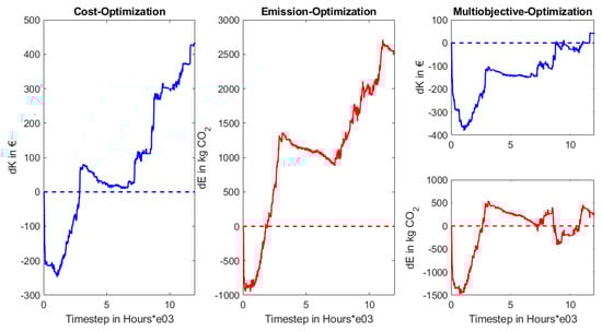 All plots show that the prediction of the sum of operating costs and CO2 emissions works very well. The individual prediction errors of the underlying models partially balance each other out over the prediction horizon. A longer prediction horizon leads to a better balance and thus to a higher degree of certainty. Whether the achieved prediction quality is sufficient to enable a meaningful optimization is discussed in Section 6.