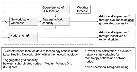 Schematic representation of the modelling approach reflecting a grid-friendly operation of a heating network.