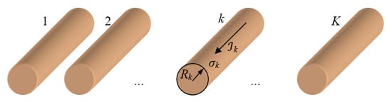 with and evaluated from Equations (7) and (8). Such an approach is equivalent to representing each wire as a set of the finite number of current filaments distributed throughout the wire cross-sections. Hence, wire , when acting on the neighboring wires, can be modeled as a set of current filaments placed at points and carrying currents (Figure 5).