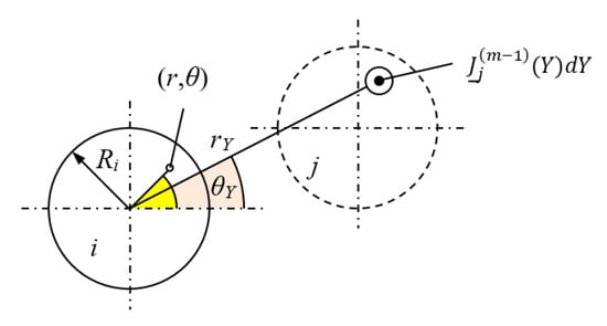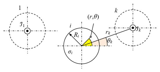 In the case of a system with multi-wire round conductors, the approximate analytical solution can be found, among others, in []. The approach is based on introducing simplifications and treating the neighboring wires as infinitely thin filaments. This leads to a fully analytical solution to a substitutive problem and is often sufficient in practice. This approximate solution will be temporarily marked with a tilde. It is convenient to use polar coordinates associated with wire —see Figure 2. If are coordinates of the axis of wire then it follows that: