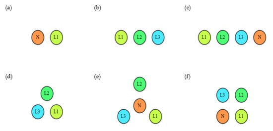 Figure 6. Analyzed current lines: (a)—twin single-phase line; (b)—flat three-phase line without N wire; (c)—flat three-phase line with N wire; (d)—trefoil three-phase line without N wire; (e)—trefoil three-phase line with N wire; (f)—three-phase line with N wire arranged in a square. - three-phase line in flat arrangement (Figure 6b,c);