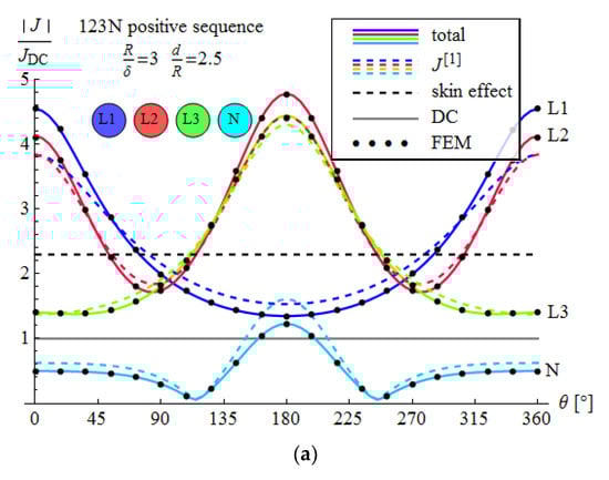 Power and communication lines with wires of circular cross-section (often called round wires) are very often used in electrical engineering. Two wires are used in single-phase cables or in communication technology. Three-phase cables with and without neutral wire are often arranged in flat or trefoil geometry. When an alternating current passes in a wire, it generates an alternating magnetic field, which induces eddy currents in the wire so that the current is pushed towards the conductor surface (skin effect) []. The current also generates eddy currents in neighboring conductors, so the current density in them is also disturbed (proximity effect). Therefore, the current density is considerably disturbed compared to the uniform density occurring during the direct current passage. As a result, the effective cross-section area drops and the resistances of the bus duct elements enlarge, which lowers bus duct ampacity and power transfer efficiency. Hence, the knowledge of current distribution in power and communication lines is important to properly assess or optimize their properties.