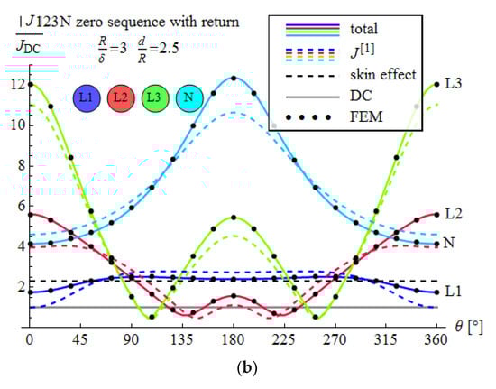 Current density distribution on wire surface for and for the flat three-phase line with N wire; values are expressed in a multiplicity of uniform current density in phase wire: (a) positive current sequence; (b) zero sequence of currents (return via N wire).