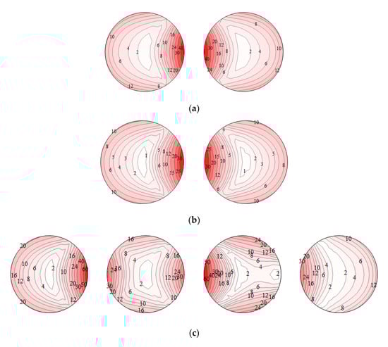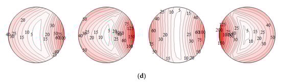 Figure 10 shows the plots of current density correction given by Equation (17) in wire cross-sections for selected configurations and supply variants. The values are expressed in percentage of uniform current density. It follows that the largest differences appear on wire surfaces. Analysis of analogous plots for the remaining configurations (not attached) leads to similar conclusions.