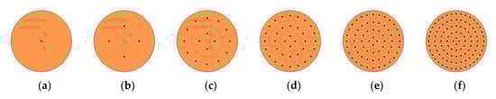 Considered variants of wire discretization. (a) = 1; (b) = 4; (c) = 16; (d) = 36; (e) = 64; (f) = 100.