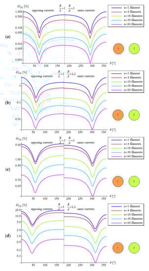Figure 12 shows the relative error in current density modulus on the wire surface in a twin line with opposing and similar currents. The left part of each plot corresponds to opposing currents, whereas the right part is for similar currents. The four plots correspond to weak and strong skin effects as well as closely or loosely placed wires. It follows that when the skin effect is weak () and the wires are not too close (, the error is below 1% even for the first approximation (Figure 12a). However, for closely placed wires () to keep the error at a level of 1%, it is necessary to take at least four filaments. In case of stronger skin effect () and not too closely placed wires, the number of filaments should be around 16. When the wires are placed closely, even more filaments are required. It is probably possible to propose a more efficient discretization. However, the results indicate that in low-frequency cases with not too close wires, it is usually enough to use the first approximation, whereas this approximation is not enough for higher frequency cases. As the frequency rises, the skin depth decreases and the eddy currents due to neighboring wires concentrate mainly near the wire surface. Therefore, eddy current density is expected larger near the wire surface, whereas very small in deeper layers. In such cases, it would be more efficient to use a denser mesh of filaments near wire surfaces with fewer filaments near the wire axis. Of course, it should be kept in mind that this model is valid for frequencies at which displacement currents can be neglected, as stated in Section 2.1.
