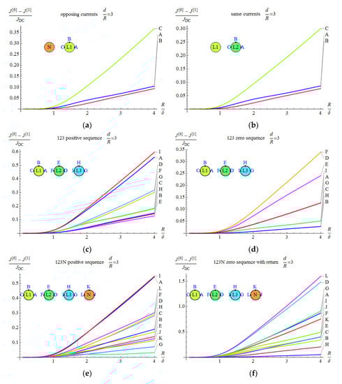 Modulus of correction given by. Equation (17) at specific points in non-flat three-phase configurations for selected variants of supply currents at the spacing between the wires equal to wire radius () vs. ratio (which is proportional to the square root of frequency); values of current density relative to uniform current in phase wire. (a) trefoil three-phase line with 3 wires and positive sequence of currents; (b) trefoil three-phase line with 3 wires and zero sequence of currents; (c) trefoil three-phase line with 4 wires and positive sequence of currents; (d) trefoil three-phase line with 4 wires and zero sequence of currents; (e) three-phase line arranged in a square with positive sequence of currents; (f) three-phase line arranged in a square with zero sequence of currents.