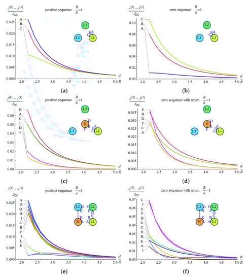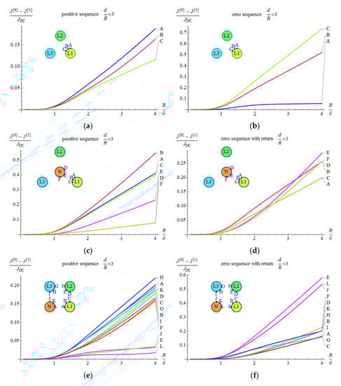 Modulus of correction given by. Equation (17) at specific points in non-flat three-phase lines for selected variants of supply currents for vs. ratio; values of current density relative to uniform current in phase wire. (a) trefoil three-phase line with 3 wires and positive sequence of currents; (b) trefoil three-phase line with 3 wires and zero sequence of currents; (c) trefoil three-phase line with 4 wires and positive sequence of currents; (d) trefoil three-phase line with 4 wires and zero sequence of currents; (e) three-phase line arranged in a square with positive sequence of currents; (f) three-phase line arranged in a square with zero sequence of currents.