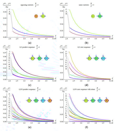 Modulus of correction given by Equation (17) at specific points in twin line and flat three-phase lines for selected variants of supply currents for vs. ratio; values of current density relative to uniform current in phase wire. (a) twin line with opposing currents; (b) twin line with the same current; (c) flat three-phase line with 3 wires and positive sequence of currents; (d) flat three-phase line with 3 wires and zero sequence of currents; (e) flat three-phase line with 4 wires and positive sequence of currents; (f) flat three-phase line with 4 wires and zero sequence of currents.
