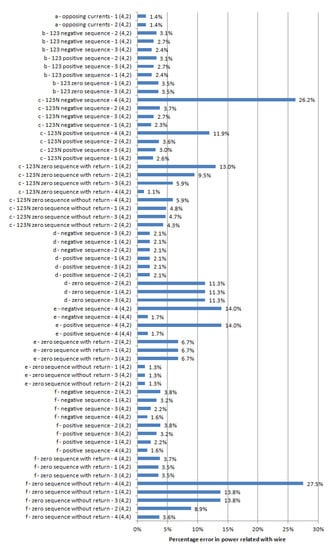 Percentage error for selected variants of supply in the considered configurations (a–f as in Figure 6); numbers in parentheses show and ratios and the preceding number is the number of the wire, where 4 is attributed to N wire.