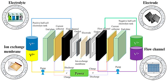 Component schematic of an all-vanadium redox flow battery (all-V RFB).