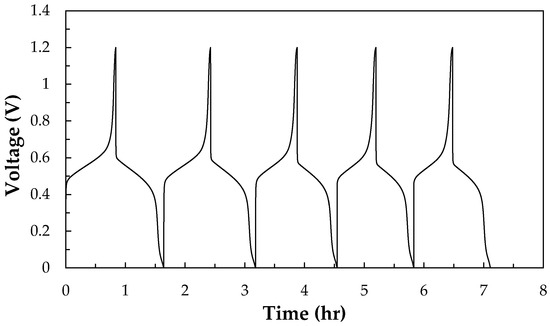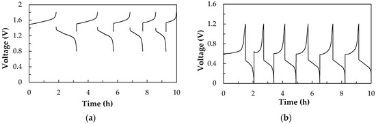 Figure 2 shows the performances of the all-V RFB and V/I RFB without the modified key materials during the charge-discharge tests for 10 h. The Nafion 117 (N-117) membrane is as a separator and carbon paper electrodes as the anode and cathode with a serpentine-type flow channel. The cell’s average performances of four cycles, CE%, VE%, and EE% were calculated by Equations (7) to (9), as shown in Table 1. The all-V RFB system presents a higher EE% (62%) than that of the V/I RFB (57%), because the V/I RFB shows a lower VE% (61%); however, it shows a higher CE% (93%) and a discharge capacity (495 mAh) than of that of the all-V RFB (79%) and (416 mAh). This means that all-V RFBs experience crossover and no cross contamination, however, less are shown for the V/I RFB. In addition, the carbon paper electrode may be unapplicable in the cathode of the V/I RFB because it presents a lower VE%.