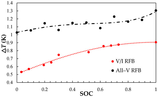 The temperature change (ΔT) of charge-discharge by monitoring of an infrared thermal imaging (ITI) of all-V RFB and V/I RFB as a function of the state of charge (SOC).