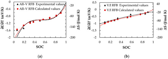 Figure 4 shows that the (∂E/∂T) measured by monitoring of the ITI compared to the calculated (∂E/∂T) as a function of the SOC for (a) the all-V RFB and (b) the V/I RFB, and the thermodynamic quantities are listed in Table 3. Acoording to the literature [19,38,39], the calculated value of the (∂E/∂T) can be obtained by taking the derivative of Equation (16), where the (/∂T) is the standard temperature coefficient, R is the gas constant, F is the Faraday constant (96485 C/mol), CH+ is the proton concentration, and Ce is the electroyte concentration [19].