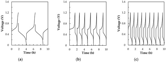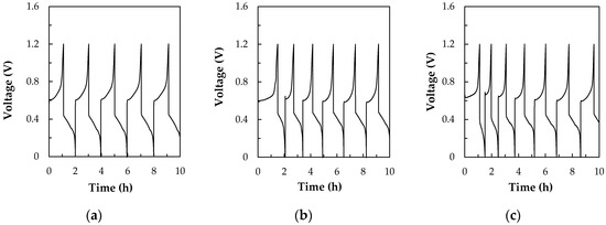 Charge-discharge cyclic diagrams of for V/I RFB. The 1.0 M VOSO4/2.0 M H2SO4 was as the positive electrolyte, and iodine/ascorbic acid solutions as the negative electrolyte by carbon paper electrode as the anode and cathode, respectively, N-117 membrane as a separator with a serpentine-type flow field at a current density of 40 mA cm−2 with different flow rate by monitoring of the ITI (a) 30 mL/min, (b) 60 mL/min, (c) 90 mL/min.