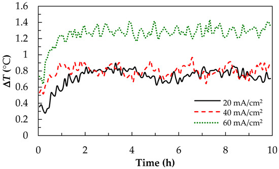 The temperature change (ΔT) vs. the charge-discharge cycle time for V/I RFB by Figure 7 charge-discharge conditions with different current density by monitoring of the ITI in: 20 mA/cm2, 40 mA/cm2 and 60 mA/cm2.