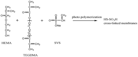 Photo-polymerization of a fixed amount of hydroxyethylmethacrylate (HEMA) mixed with sodium vinyl sulfonate (SVS) monomers, using triethylene glycol dimethacrylate (TEGDMA) as a cross-linking agent and UV-184 as a photo-initiator, were carried out with the power of 5Watt UV-light in a 5 × 5 cm2 dich to obtain the primeval membrane. Then, this membrane was washed by ethanol to remove the un-reactant and was soaked in HCl aqueous solution for 24 h to form the HS-SO3H membrane. The structural characteristics of the HS-SO3H ion exchange membrane was identified by a Fourier transform infrared spectrometer FT-IR (U-2001, HITACHI, Tokyo, Japan) in absorption mode, and looking at the wavelength ranging from 400 to 4000 cm−1 with a resolution of 4 cm−1.