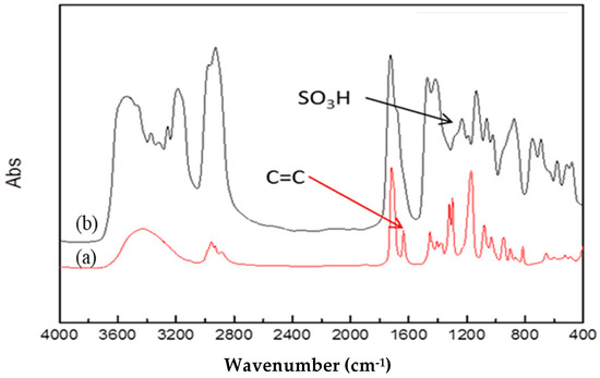 The reaction scheme of the HS-SO3H cross-linked membrane and the functional structures of the HS-SO3H membrane were confirmed by the FT-IR spectra, as shown in Figure 9 and Figure 10. In the reaction scheme, the reaction center is focused on the complete reaction degree of the vinyl (C=C) groups, as well as the formation of the sulfonic acid (-SO3H) groups. The FT-IR spectra can see that the C=C functional groups of the HEMA, TEGDMA, and SVS monomers disappeared (1667–1640 cm−1) for the HS-SO3H cross-linked membrane. At 3200 cm−1 and 1300–1400 cm−1, these absorption peak regions correspond to the -OH group stretching vibration of the -SO3H groups, as well as the S=O group antisymmetric and symmetric stretching vibration of the -SO3H groups. At 3600 cm−1, the absorption peak corresponds to the -OH group stretching vibration of the poly (HEMA) [47]. From the above FTIR information, the HS-SO3H membrane should be successfully synthesized by the photo-polymerization.