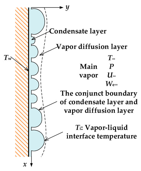 Marangoni condensation is a condensation process of mixture vapors. The schematic diagram of Marangoni condensation on a vertical plate is shown in Figure 1. The condensate layer and the vapor diffusion layer are located between the condensing surface and main vapors. The condensate layer is non-filmwise, and a vapor diffusion layer exists in Marangoni condensation. However, the condensation modes of Marangoni condensation are similar to the dropwise condensation of pure vapor on hydrophobic surfaces. According to the feature of Marangoni condensation, condensation can be treated as dropwise condensation of mixture vapors.