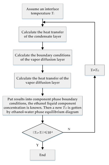 Figure 2 shows the calculation process of the proposed model. First, a vapor-liquid interface temperature Ti is assumed, and the mean heat flux of the condensate layer is calculated. Then, the boundary conditions at the vapor-liquid interface can be derived, as well as that for the upper boundary of the vapor diffusion layer. On this basis, Equations (23) and (25) can be solved. With the results integrated into the component conservation conditions at the interface, the ethanol liquid concentration can be obtained. A new interface temperature Ti2 is determined by the ethanol-water phase equilibrium diagram. If the difference between Ti and Ti2 is less than the set value, then the assumed value of Ti can be considered as the actual vapor-liquid interface temperature. Otherwise, the value of Ti should be reset and recalculated until the difference is less than the set value.