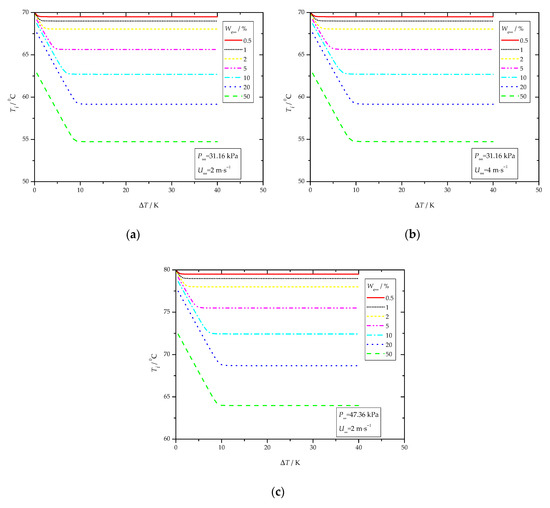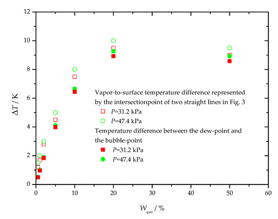 Figure 3 shows the calculated results of the vapor-liquid interface temperature under different conditions. The vapor-liquid interface temperature declines rapidly up to a certain value, and then remains almost constant, with the increase in the vapor-to-surface temperature difference. In the decline region, the vapor-liquid interface temperature nearly drops linearly. The vapor-liquid interface temperature decreases from the dew-point temperature to the bubble-point temperature with the increase in the vapor-to-surface temperature difference. The corresponding vapor-to-surface temperature difference that is represented by the intersection point of two straight lines in Figure 3, where the vapor-liquid interface temperature just approaches the bubble-point temperature, is related to the temperature difference between the dew-point and the bubble-point. Figure 4 shows the comparisons of the vapor-to-surface temperature difference and the temperature difference between the dew-point and the bubble-point under different conditions. As shown in Figure 4, with the increase in the ethanol vapor concentration, the corresponding vapor-to-surface temperature difference increases first and then decreases. The maximum value is observed at the ethanol vapor concentration of 20%. The vapor-to-surface temperature difference is slightly larger than the temperature difference between the dew-point and the bubble-point, and the deviation is about 0.5–1.5 K.