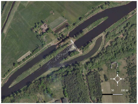 There are several similar barrages along the Noteć River, some of which have been developed for power generation [40]. Płaczek et al. [41] distinguish four sections with different terrain characteristics. The location under consideration is placed within the section known as the Canalized Noteć.
